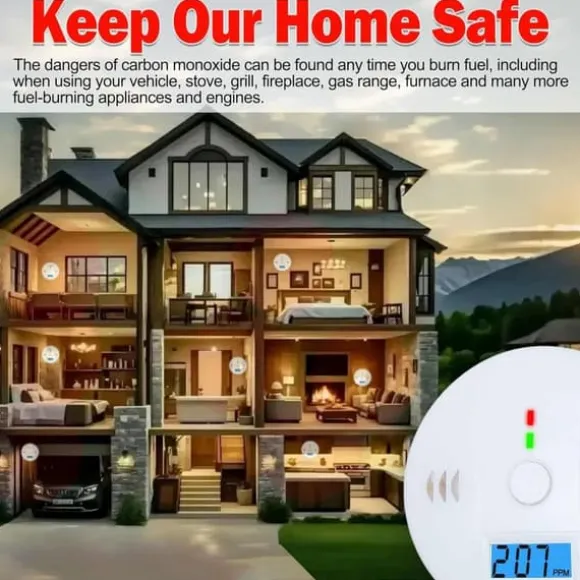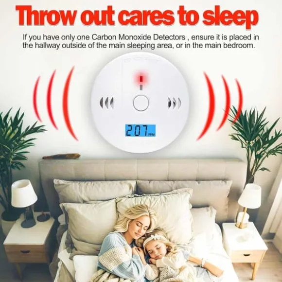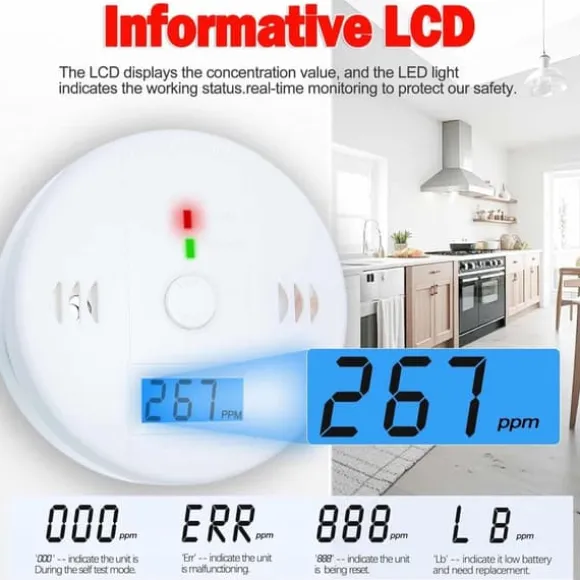Omedelbar varning: När kolmonoxiddetektorn når larmnivån detekterar CO-sensorn CO, den röda lysdioden blinkar och LCD-skärmens blå bakgrundsbelysning tänds, vilket ger ett högt 85 dB-larm för tidig varning.
