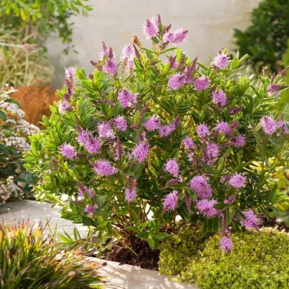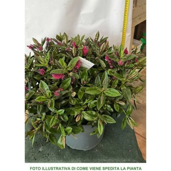 L’hebe addenda är en rustik hybrid med gröna blad som är beige vid kanterna. Den har en riklig blomning med korta blomställningar i färgen lila, och det är lämpligt att ta bort torra delar för att ge ny livskraft åt växten. Den är av låg hårdhet, så det är bra att skydda den under vintern. Blomstring: augusti – sen höst. Den växer upp till 90-100 cm i höjd. Höjd på växten vid försäljning: cirka 20-25 cm i kruka 27 cm. Observera: Höjden på växten kan variera beroende på vilken säsong den köps.