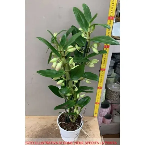 L’orchidé Dendrobium eller Bambúch orchidé, är en mycket robust sort, lätt att odla, uppskattad för sin vackra bladverk och sina mycket dekorativa vita blommor som regelbundet dyker upp åren som följer. En sort som med enkelhet och elegans lyckas förvandla varje miljö och just därför är det en av de mest älskade arterna bland blom- och växtälskare av alla slag. Dendrobium behöver mycket ljus året runt, men får inte utsättas för direkt solljus för att undvika bladbrännskador. På sommaren kan växten flyttas utomhus i skuggan av ett träd eller på en skyddad plats. Den tål inte temperaturer under 10°C och klarar knappt de över 35°C. Efter blomningen och bladfällningen, för att underlätta vegetativ vila, bör Dendrobium flyttas till en ljus och sval plats med temperaturer runt 10°C. Temperaturväxlingarna kommer att främja blomningen nästa vår. Såld i kruka med cirka 12cm diameter (se foto). BLOMMANS FÄRG ÄR VIT, ROSA ELLER FUCHSIA BEROENDE PÅ TILLGÄNGLIGHET I VIVAIET. Växthöjd vid försäljningstillfället: cirka 40cm. Observera: Höjden på den perenna växten kan variera beroende på säsongen den köps.