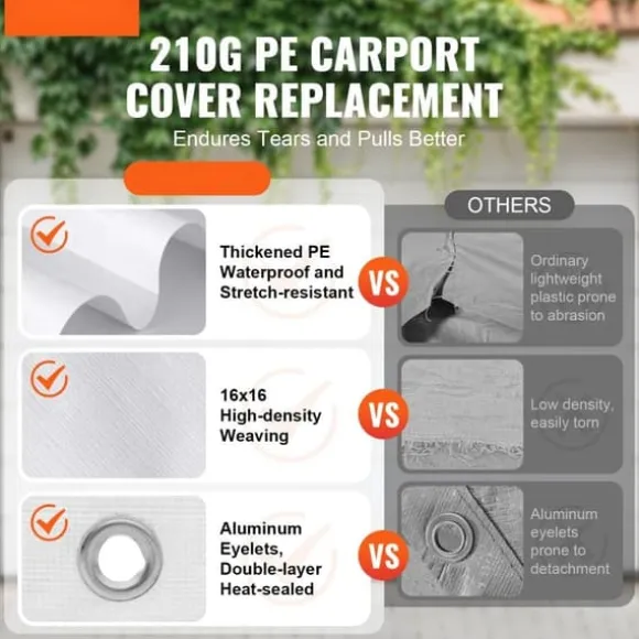 Hållbart material: Den övre duken av baldakinen är tillverkad av 210 g PE-plast, medan sidodelarna är gjorda av 180 g PE-plast. Båda är tillverkade med ett 16 x 16 vävmönster för ökad tjocklek och hållbarhet mot vattenansamlingar. Dubbellager av varmt förseglade sömmar och förstärkta kardborreband säkerställer hållbarhet och lång livslängd.