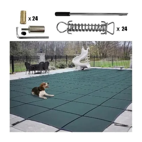 Poolskyddet är tillverkat av polypropenmaterial, robust och slitstarkt, lämpligt för simbassänger upp till 16 x 36 fot. Dessutom kommer detta poolskydd med komplett hårdvara för enkel installation och säkerhet, inklusive mässingsankare, fjädrar i rostfritt stål och installationsverktyg. Därför är det ett idealiskt verktyg för att hålla din pool ren och i gott skick hela vintern.