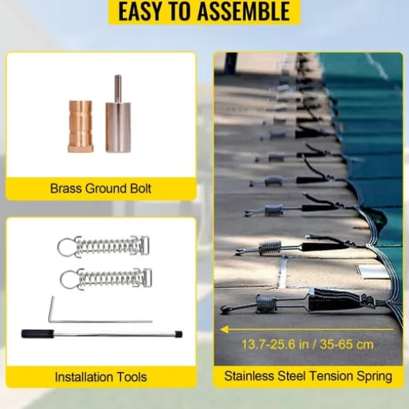 Detta poolskydd levereras komplett med tillbehör och hårdvara för enkel och säker installation, inklusive mässingsankare, fjädrar i rostfritt stål och installationsverktyg. Beroende på poolens storlek kan längden på repet justeras mellan 35-65 cm.
