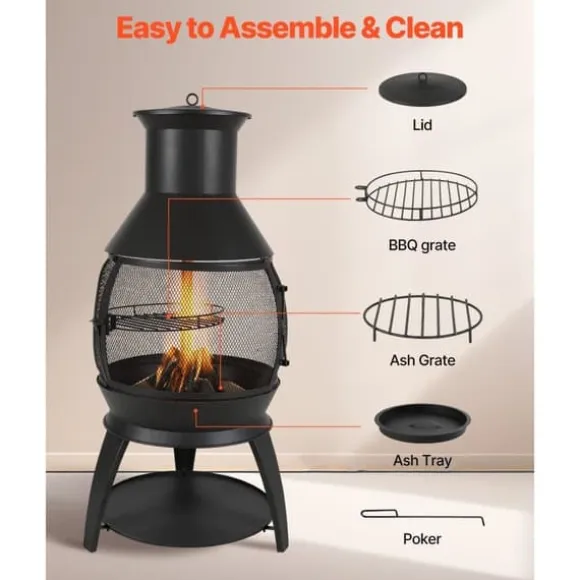 Denna skorsten är designad för att ge dig bättre bekvämlighet med snabb montering och enkel rengöring. Oavsett om du lagar mat eller håller dig varm utomhus, är denna skorsten utrustad med allt du behöver – skorstenslock, grill, askgaller, askfat och eldpoker – för att göra din upplevelse smidig och njutbar.