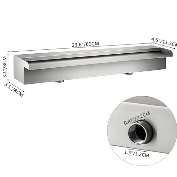 -Poolfontänens mått: Poolvattenfallsfontänens mått: 23,6 tum x 4,5 tum x 3,1 tum. Vatteninloppsdiameter: 1,3 tum. Vattenflödesbredd: 23,6 tum. Det kan lägga till dekoration till din trädgård, uteplats, damm eller pool, vilket gör den mer elegant, snygg och vacker.