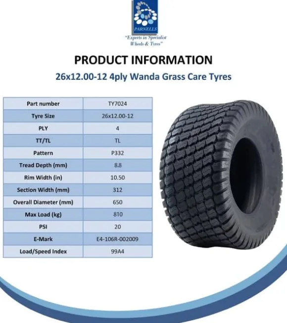 Till salu finns 4 nya 26×12.00-12 Wanda (Journey) P332 gräsklippardäck.