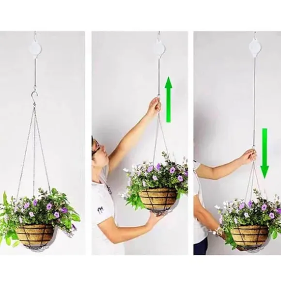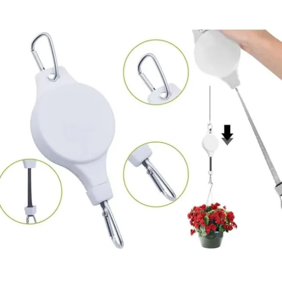 Detta justerbara upphängningskrok är en smart och praktisk lösning för hemmet, terrassen eller trädgården. Med en utdragbar och förstärkt nylonrem kan du enkelt sänka ner dina hängande blomkrukor för att vattna dem och sedan lyfta upp dem igen utan ansträngning. Perfekt för högt placerade växter, fågelmatare, lampor och andra hängande föremål. Enkel att montera och otroligt användarvänlig.