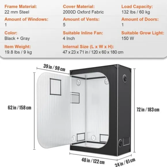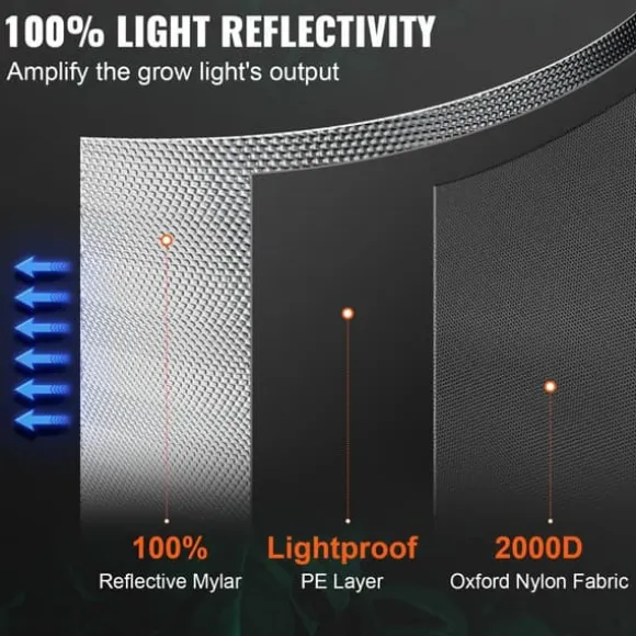 Vårt växthus är tillverkat av högkvalitativ, rivtålig 2000D Oxford-stoff, som har en högre densitet och bättre ljusblockering än 600D. Innerväggen i tältet är 100 % reflekterande Mylar, vilket ger dina växter den perfekta växtmiljön.