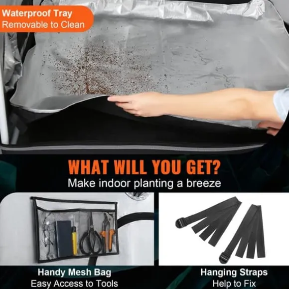 Vårt 2 x 4 fot stora växthus har insynsfönster så du kan övervaka dina växter när som helst. För att förhindra ljusinsläpp är fönstren omgivna av 40 mm tjockt kardborreband. Vi har även inkluderat en avtagbar bottenlåda och en verktygshållare för att underlätta underhåll och omedelbar användning av tältet.