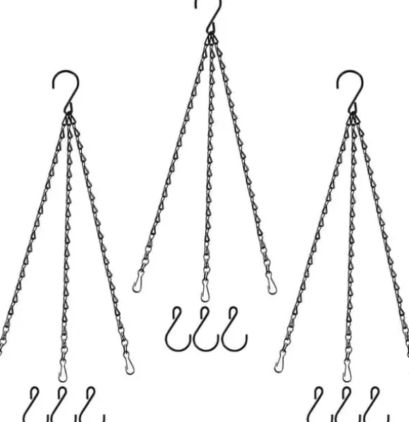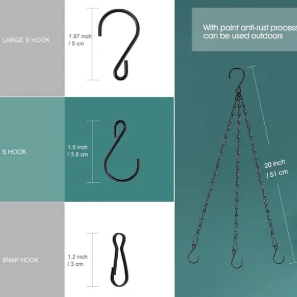 Utmärkt väderbeständighet: Kedjan och krokarna är tillverkade av järn med en rostskyddsbeläggning och har en förstärkt konstruktion som enkelt bär upp blomkrukor, fågelholkar med mera. Du behöver inte oroa dig för att kroken faller från en gren – konstruktionen står emot tufft väder och skyddar mot frost, sprickor och flagning.