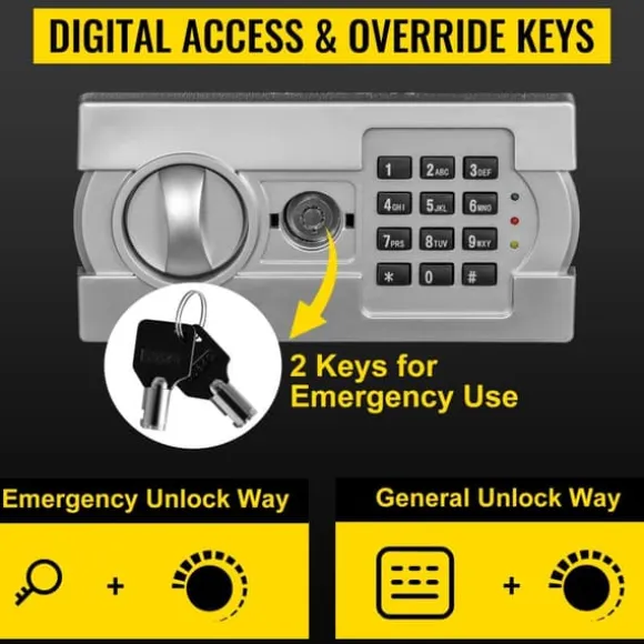 -Två upplåsningsmetoder: Användare kan använda den medföljande nyckeln eller en anpassad digital kod programmerad av sig själva. Systemet kan ändras i all oändlighet. Det finns en röd knapp för återställning av lösenord på baksidan av dörren. Magnetiska lås låser automatiskt kassaskåpet utan nyckel eller kombination.