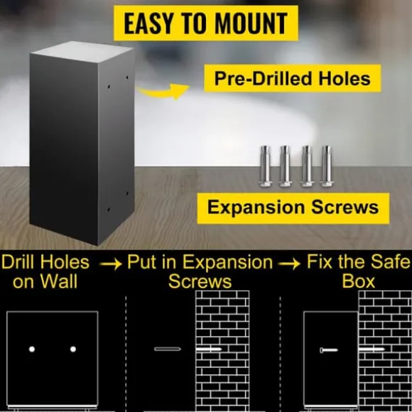 -Enkel installation: Det digitala kassaskåpet kommer med förborrade hål för bättre fäste i golv, vägg eller skåp. Fyra 1,5V AA-batterier driver kassaskåpet.