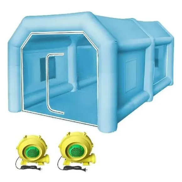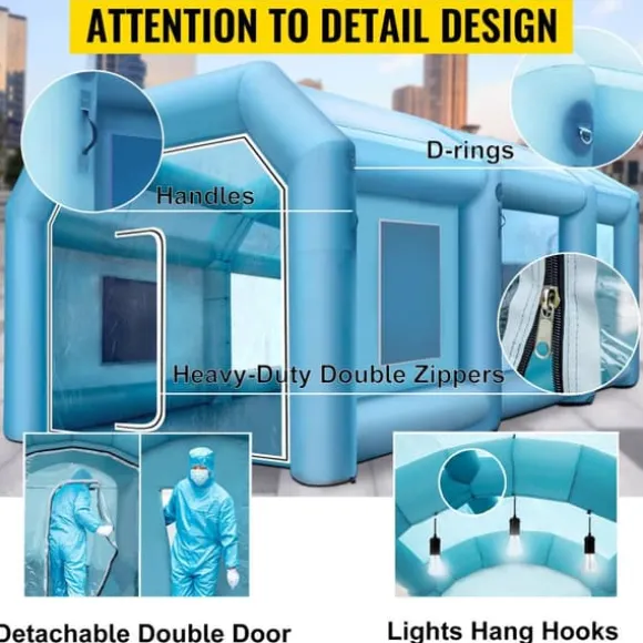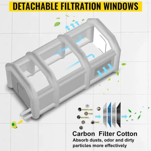 Denna uppblåsbara målarbås är gjord av 210D Oxford-tyg och PVC-material, som är hållbart och fläckbeständigt. Den har ett enormt utrymme och kommer med ett filtrerat fönstersystem, en uppblåsningsfläkt och en ventilationsfläkt. Dessutom är dörren avtagbar och kan öppnas med dragkedja. Den är idealisk för målning av bildelar, maskinreparation och mer.