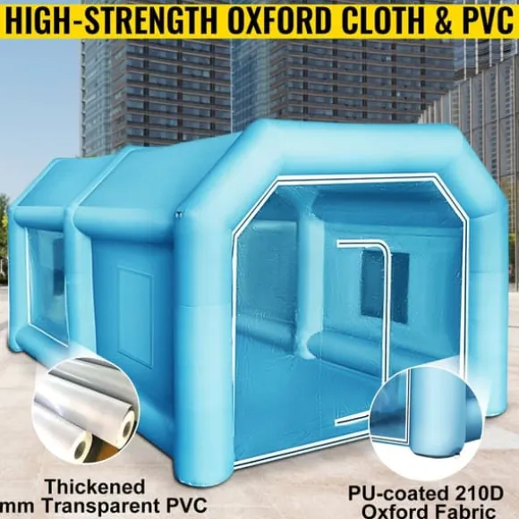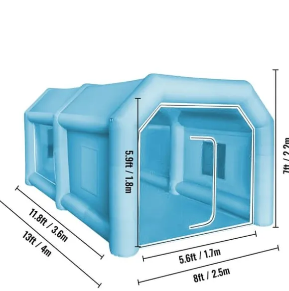 Denna uppblåsbara målarbås är gjord av 210D Oxford-tyg och PVC-material, som är slitstarkt, rivsäkert och fläckbeständigt. Dess yttre mått: 13 x 8 x 7 fot. Rymlig nog att måla din bil eller motorcykel.