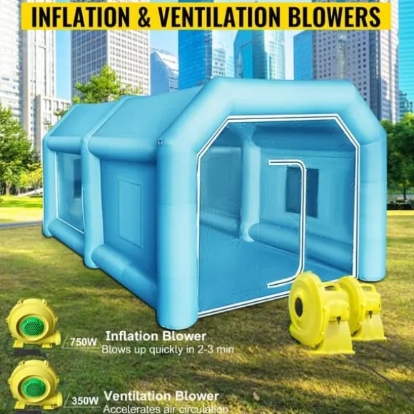 Denna uppblåsbar målarbås kommer med en 750W uppblåsningsfläkt och en 350W ventilationsfläkt. En för snabb uppblåsning och den andra för effektiv ventilation i båset.