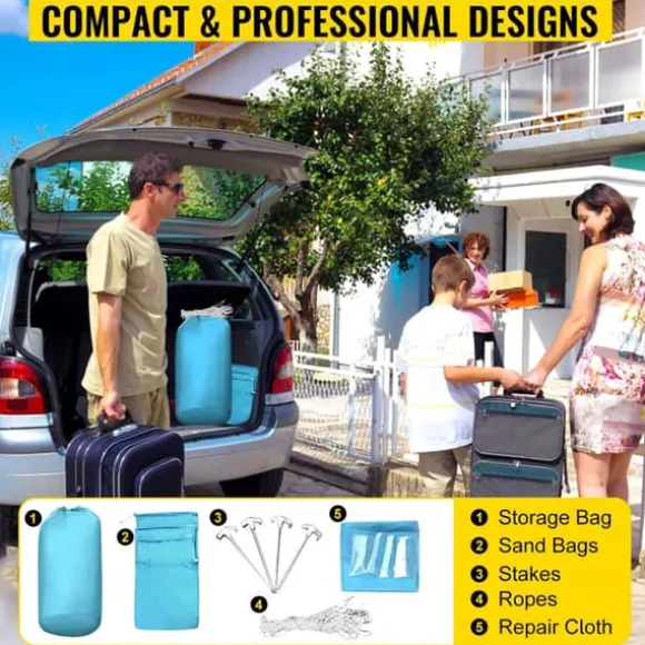 Levereras med en väska för att förvara det tömda båset, kompakt och lätt att bära. Den kommer också med 4 rep, 4 träpålar, 4 sandsäckar och en uppsättning reparationslappar för enkel användning.