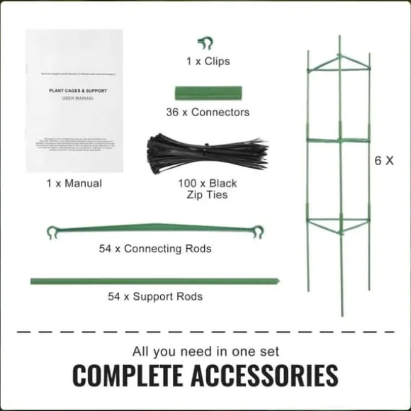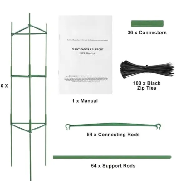 Produktspecifikationer: Vårt tomattorn inkluderar 54 vevstakar, 54 stödstänger, 36 kopplingsrör, 1 klämma, 100 svarta dragkedjor och 1 bruksanvisning. Varje komponent är finsmidd för långvarig användning.