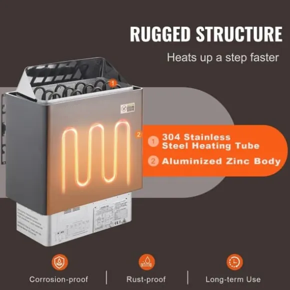 Bastuaggregatet är tillverkat med ett aluminiserat zinkskal för att motstå korrosion och fukt, vilket ger lång livslängd. De 304 rostfria stålvärmeelementen säkerställer en effektiv och jämn värmefördelning för optimal komfort.