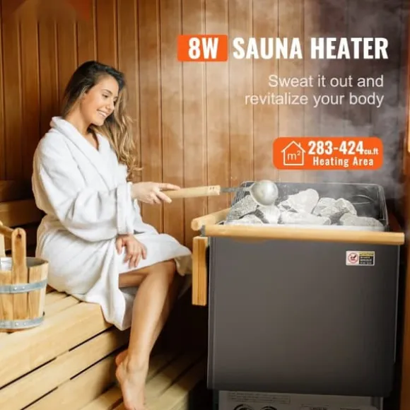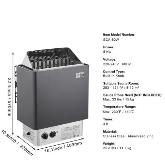 Med en effekt på 8KW är denna hembastuugn idealisk för basturum på 283-424 ft³ / 8-12 m³. För den ultimata bastuupplevelsen behövs bastustenar (bastustenar INGÅR INTE).