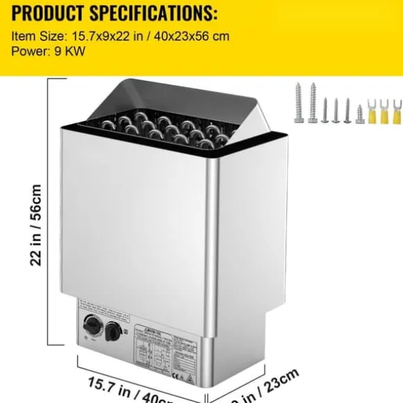 Effekt: 9 kW; Driftspänning: 380-415 V; Strömstyrka: 13,5 A; Lämpligt basturum: 317-459 kubikfot (9-13 m³), 6,2 fot (190 cm) höjd; Kräver bastustenar: 35 lbs (16 kg); Temperaturintervall: 86-230 ℉ (30-110 ℃). Observera: Bastustenar ingår INTE.