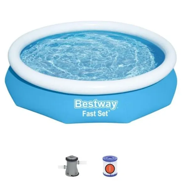 Lätt och snabbt att sätta upp, Bestway® Fast Set™ poolen låter dig slappna av vid din nya pool på nolltid. Den ultrasimpla installationsmetoden Fill & Rise™ ”fyllning-montering”: allt du behöver göra är att välja en plan yta, blåsa upp den övre ringen och poolen kommer att resa sig allt eftersom den fylls med vatten. Liner är tillverkad av DuraPlus™, ett extremt hållbart material som består av 3 förstärkta lager, 85 % mer motståndskraftigt mot punktering än PVC. När sommaren är över kan du snabbt och enkelt förvara poolen. Töm enkelt vattnet med den kontrollerade dräneringsventilen innan du viker ihop poolen för att förvara den under vintern. En filtreringspump med patron ingår också för att hålla vattnet rent. Den är perfekt för familjer som letar efter en snabb och enkel poollösning i trädgården. Barn kommer att älska att spendera sina sommardagar med att plaska och leka i vattnet, och föräldrar kan också njuta av en trevlig och avkopplande simtur. Sommaren är inte riktigt sommar utan Bestway® Fast Set™ poolen!