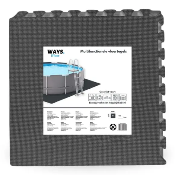 Inklusive WAYS D’luxe Golvplattor – antracitFör att skydda ditt poolgolv på rätt sätt, levereras detta poolpaket inklusive våra WAYS D’luxe golvplattor. Till skillnad från en markduk är dessa golvplattor extra tjocka och ger extra komfort för dina fötter när du går i poolen. Dessa plattor levereras med avslutningskant. Vi har räknat ut hur många plattor du behöver, så att du kan förse hela din pool med dessa golvplattor.