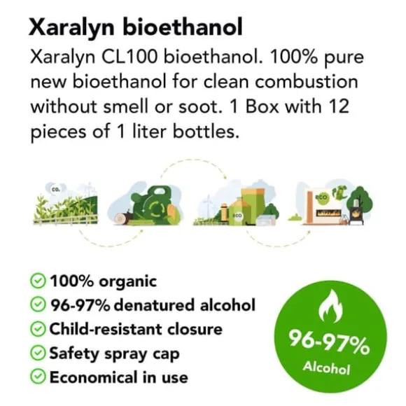 Xaralyn bioetanol CL100 brinner i en tyst och behaglig gul låga, utan att avge någon lukt. Regelbundet utförda omfattande tester garanterar den höga kvaliteten på våra produkter. Vid förbränning omvandlas bioetanol Xaralyn CL100 uteslutande till vattenånga och koldioxid. Det är de minst skadliga förbränningsprodukterna som en eldstad kan avge.
