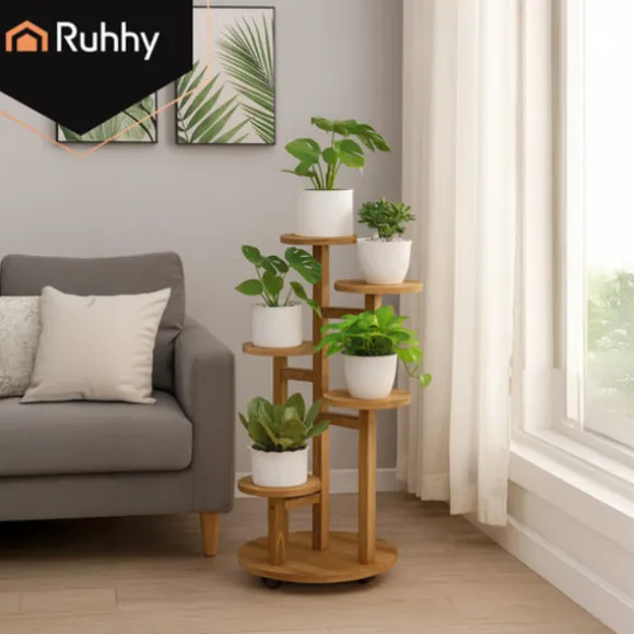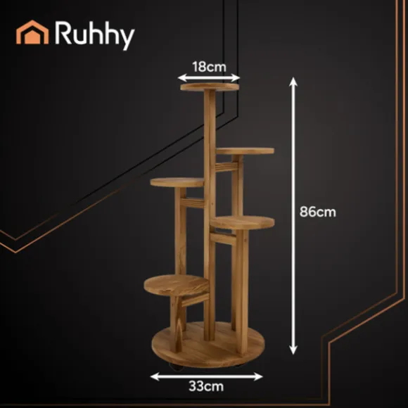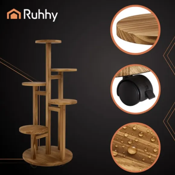 Stiligt och funktionellt RUHHY blomsterställ gjort av naturligt furu kan hålla upp till 7 krukor på 6 nivåer. Perfekt för vardagsrummet, balkongen eller terrassen – det ger en attraktiv visning av växter, sparar utrymme och är lätt att arrangera. Tack vare sina låsbara hjul kan du enkelt flytta det dit du vill.