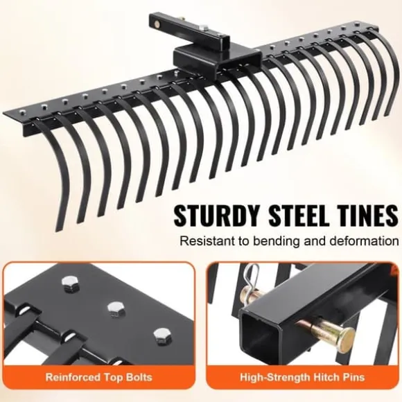 Rostsäker beläggning: Vår bogsera bakom gräskratta har en design av helt stål med en rostsäker pulverlackerad finish för korrosionsbeständighet, vilket säkerställer långvarig användning under hela säsongen utan att rosta.