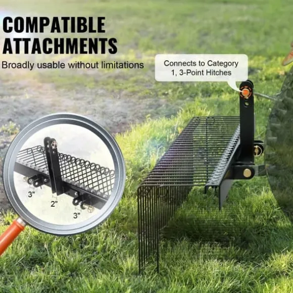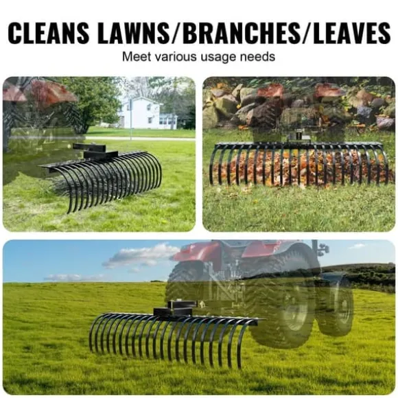 Universell kompatibilitet: Grästraktorkrattan kan användas med 48″ eller 60″ verktygsstänger och trepunktsupphängningssystem, som enkelt kan anslutas till olika ATV-lantbruksmaskiner.