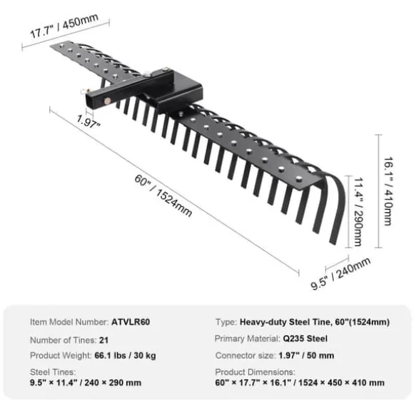 Bred arbetsbredd: Med en arbetsbredd på 60 tum täcker draget bakom landskapsräfsan stora ytor, vilket ökar effektiviteten och sparar tid. Det är det perfekta verktyget för att effektivt rengöra stora gårdar och gräsmattor.