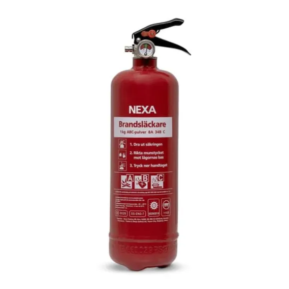 Nexas 1kg ABC- pulversläckare är kvalitetssäkrad och certifierad av DNV. Återfyllningsbar av behörig servicetekniker. Produkten är CE-märkt.
