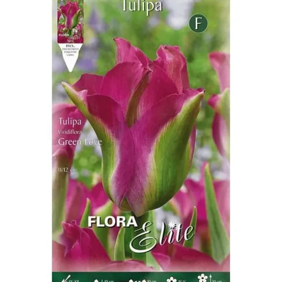 Tulpaner Viridiflora Green Love: denna sort når en höjd av ca. 30 cm och blommar i maj. Idealiska för rabatter och krukor. Odling: plantera dem mellan september och december. Tips: lämpliga som snittblommor. Förvara i en torr och väldoftande miljö fram till odlingsmomentet. Odlad lökar. Bulkkarakteristika: 7 lökar storlek 11/12; Att naturalisera i rabatter och krukor; Färg: fuchsia; Planteringsmånad: 9-10-11-12; Blomning månad: 4-5; Höjd: 30 cm; Ljus: Sol; Doft: Nej; Snitta: Ja.
