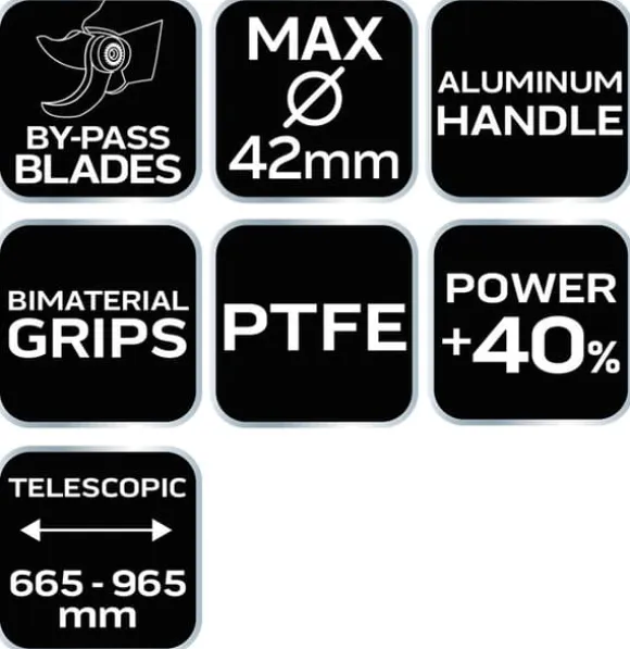 NEO TOOLS 665 mm bypass-sekatör, 42 mm skärkapacitet, växellåda, teleskophandtag, 15-253 är ett professionellt verktyg för trädgårdsarbete med upphöjda växter, utan behov av stege. Lätta aluminiumarmar med teleskopisk förlängning gör att du kan hålla verktyget upprätt utan onödig muskelbelastning. Den extra halkfria handtagsbeläggningen i dubbelt material förbättrar greppet. Saxen är konstruerad för grenar med en maximal diameter på 42 mm. Den växelstyrda spaken ökar skärkraften med 40 %. Bypass-mekanismen ger större precision. Saxens blad är belagda med en non-stick-beläggning och är lämpliga för att skära färskt trä. Detta verktyg rekommenderas för både proffs och trädgårdsentusiaster.