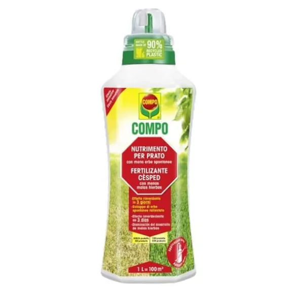 Flytande näring för gräsmatta med mindre ogräs 1lt Compo Ren gräsmatta med mindre ogräs är en flytande gödsel för gräsmattor. Speciellt utformad för att skapa en ogynnsam miljö för tillväxt av oönskade ogräs och mossa tack vare det höga innehållet av chelaterat järn, närar och stöder gräsets tillväxt tack vare det snabba kväveinnehållet, ger en snabb grönande effekt för gula gräsmattor tack vare närvaron av järn och mikroelement. Förpackad i flaska av 90% återvunnen plast. Närar och friskar upp gräsmattan. Garanti för grönande effekt på endast 3 dagar. Skapar en ogynnsam miljö för tillväxt av oönskade bredbladiga ogräs och mossa. Enkel dosering utan slöseri: mätlock med droppskydd. Återvunnen och återvinningsbar flaska.