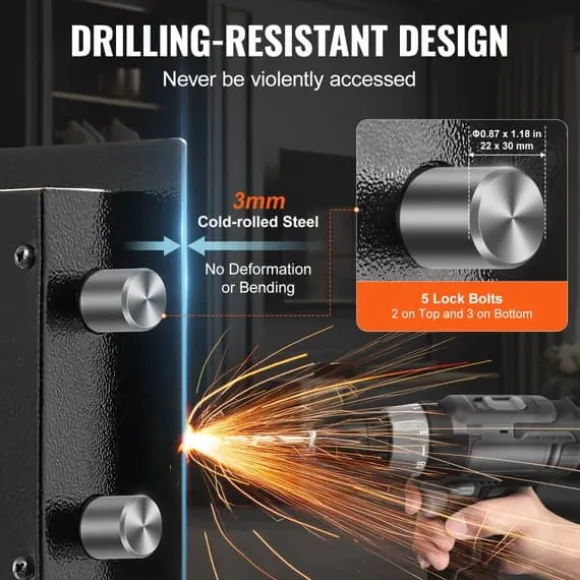 Värdeskåpet är tillverkat av högkvalitativt legerat stål med en 3 mm tjock dörrplatta för att säkerställa maximal säkerhet. Utrustad med 5 rejäla dörrbultar ger den ett överlägset skydd mot eventuella inbrottsförsök.