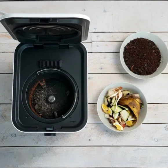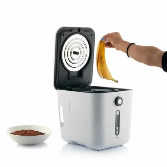 En toppmodern elektrisk kökskompost som torkar, strimlar och kyler organiskt hushållsavfall till näringsrik naturlig kompost. Den har ett självrengörande system.