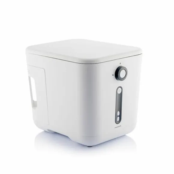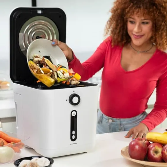 En toppmodern elektrisk kökskompost som torkar, strimlar och kyler organiskt hushållsavfall till näringsrik naturlig kompost. Den har ett självrengörande system.