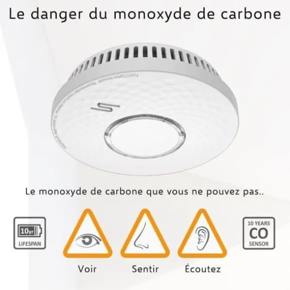 ELRO FV4310 varnar både för rök och förhöjda halter kolmonoxid. Enheten har ett inbyggt litiumbatteri med cirka 10 års livslängd (ej utbytbart) och kombinerar en optisk röksensor med en elektrokemisk CO-sensor, samt en testknapp för funktionskontroll.