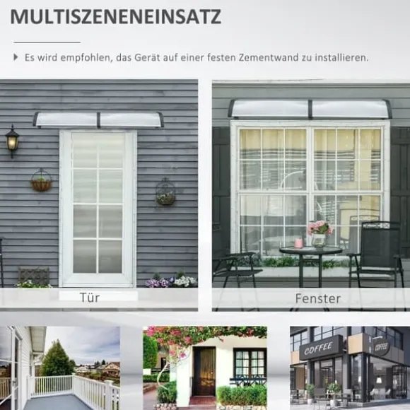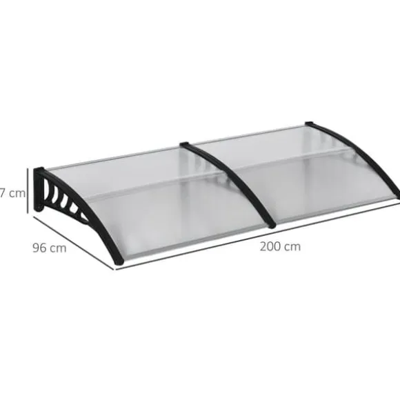 – Utvalda material: Detta dörrtak är tillverkat av 5 mm tjockt, transparent polykarbonat, plastfästen och aluminiumstänger som inte rostar. Det skyddar dina fönster, verandor och ingångar pålitligt mot nederbörd utan att någon särskild skötsel krävs