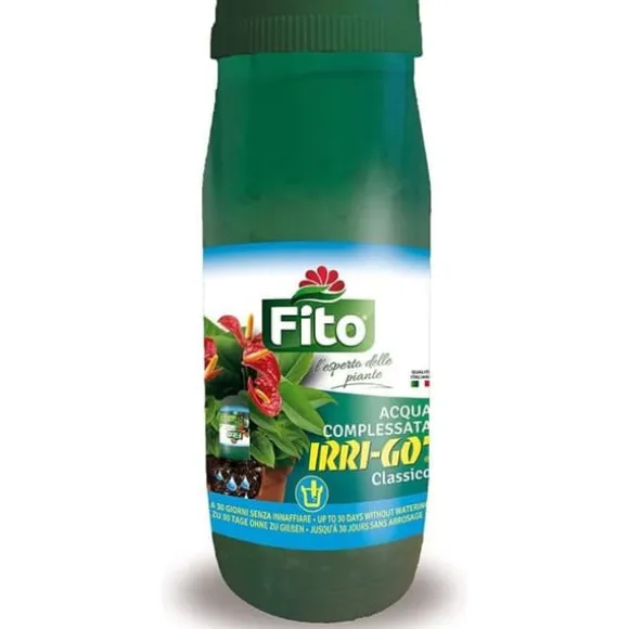 Irri-gò vatten klassisk 300ml, En lösning för att säkerställa att växterna får den vattenmängd de behöver när man inte är hemma. Fito irri-gò är lösningen för att ge växterna en vattenreserv under perioder av frånvaro. Det är en komplex vattenlösning, bestående av naturliga fibrer och avmineraliserat vatten. Mikroskopiska organismer i jorden frigör vatten genom nedbrytning av fibrerna under 20-30 dagar. Användningssätt: Efter vattning, sätt ner burken upp och ner i jordmånen så att den penetrerar några centimeter. Komplexerat vatten med cellulosafibrer Hållbarhet 20/30 dagar 300ml ERBJUDANDE BESTÅENDE AV 10ST