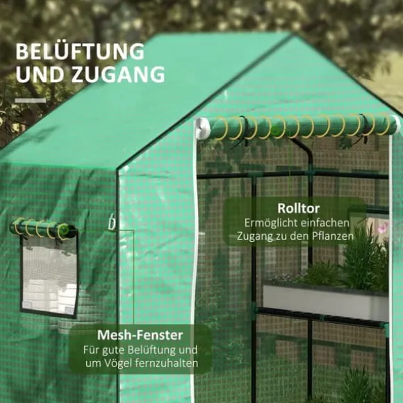 – Dörr och fönster som kan rullas upp: Den generösa dörren med dragkedja på växthusfolien ger enkel tillgång till ditt växthus, medan nätfönstren håller insekter borta och reglerar luftfuktigheten optimalt