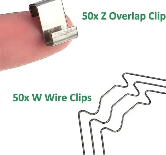 Passande storlek: W-formade trådfästen är cirka 7,7 cm långa, Z-formade överlappningsklämmor är cirka 1,2 cm långa, passande för de flesta växthusmodeller, vilket säkerställer en perfekt passform och fast montering.