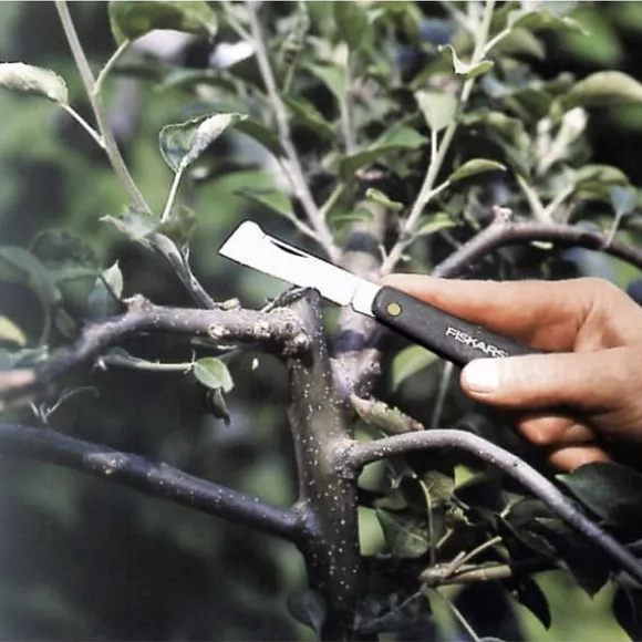 Fiskars knivar är perfekta för mindre beskärningsarbeten i trädgården. Bladet i härdat stål ger lång livslängd och speciell skärpa. Skarp kniv för ympning av växter t.ex. fruktträd eller rosor. Ensidigt slipad egg. Lås på bladryggen. Rak klinga i högkvalitativt, polerat stål (HRC 58).