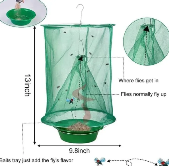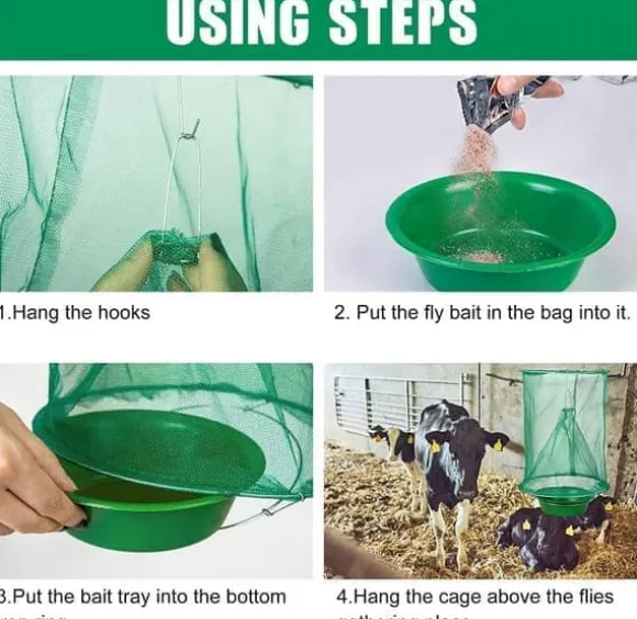 Den återanvändbara och stabila flugfällan är lätt att använda. Häll bara betet i brickan, montera fällan och häng den cirka 1 meter över marken där flugorna samlas. Flugor gillar fiskmat, men du kan också använda andra fiskinälvor, ruttna frukter eller liknande som bete. På våren och hösten rekommenderas att placera fällan på en solig plats utomhus, medan den på sommaren bör hängas i skugga.