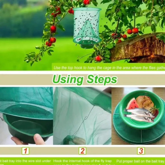 Den återanvändbara och stabila flugfällan är lätt att använda. Häll bara betet i brickan, montera fällan och häng den cirka 1 meter över marken där flugorna samlas. Flugor gillar fiskmat, men du kan också använda andra fiskinälvor, ruttna frukter eller liknande som bete. På våren och hösten rekommenderas att placera fällan på en solig plats utomhus, medan den på sommaren bör hängas i skugga.