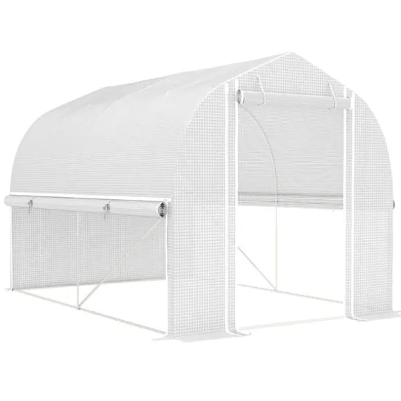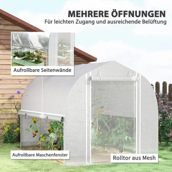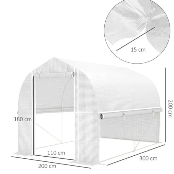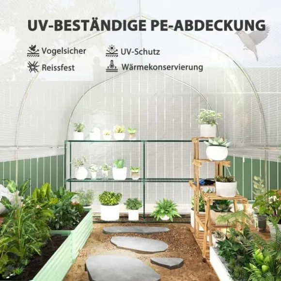 – 140 g/m² folieöverdrag: Det UV-beständiga PE-överdraget på detta tunnelväxthus skyddar mot överdriven solstrålning samtidigt som det släpper igenom 85 % av solljuset. Ett förstärkningsgaller i mitten förhindrar sprickor