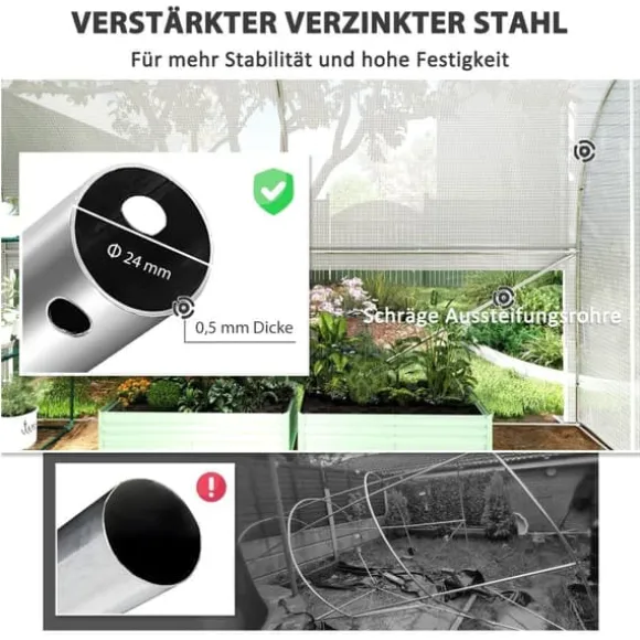 – Solid struktur: med en 24 mm tjock, galvaniserad stålram, tvärstänger, jordspett och förankringslinor garanterar detta växthus hög stabilitet