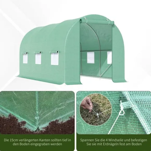 – Stark fastsättning: Växthuset kan enkelt ställas upp på både hård och mjuk mark. Folien är extra lång på sidorna så att du kan tynga ner den med stenar på marken eller gräva ner den. Den medföljande tejpen hjälper till med ytterligare fastsättningsbehov av alla slag.