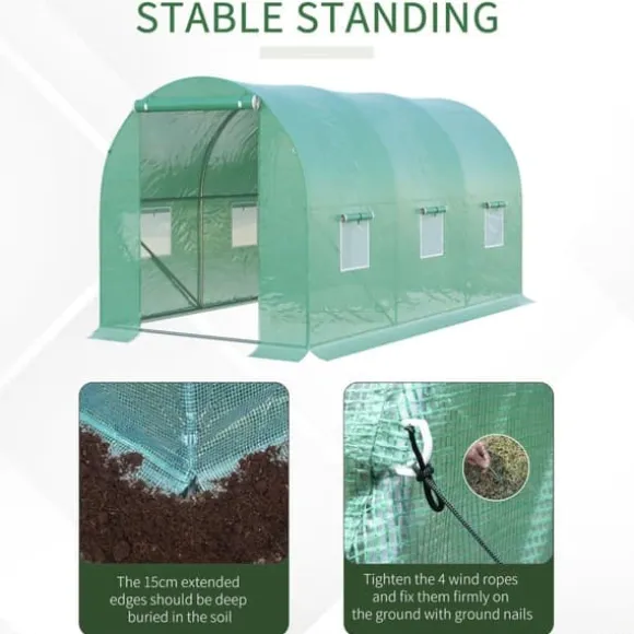 – Stark fastsättning: Växthuset kan enkelt ställas upp på både hård och mjuk mark. Folien har förlängda kanter så att du kan tynga ner den med stenar på marken eller gräva ner den. Den medföljande tejpen hjälper till vid ytterligare fastsättningsbehov av alla slag