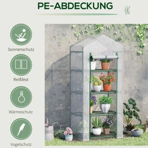 – Med växtställ: Plastväxthuset är utrustat med 4 hyllplan (höjd per fack: 34 cm, varje med max. 15 kg belastningskapacitet), så att du kan sortera dina växter på ett utrymmesbesparande och överskådligt sätt